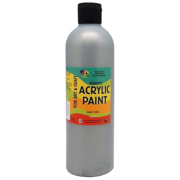 Five Star NZACRYL Metallic Silver paint is ideal for use in both the home and at school. The paint is non-toxic, water resistant, light fast and has a smooth consistency that provides good coverage with bold, bright colour. It is versatile and can be used with a variety of painting mediums such as Texture Paste, Impasto Gel, Moulding Paste and more, making it ideal for a range of creative painting projects. Suitable for use with standard & wet strength cartridge paper, newsprint, canvas card & board, acrylic paper and more. Cleans up easily with soap & water.