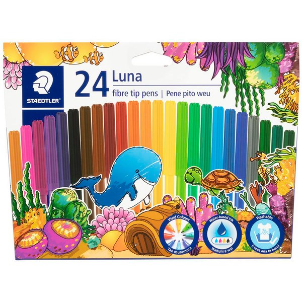 Choose these Staedtler Luna Felt Tip Markers to add bright, vivid colours to your artwork, school work, colouring in and projects. The quality felt pens have 1.0mm fine tips that are pressure resistant to last longer. The non toxic pens feature a water based ink that washes out of most textiles easily. Ink colours are designed not to fade. The pen cap is ventilated to help reduce the risk of choking if it is swallowed.