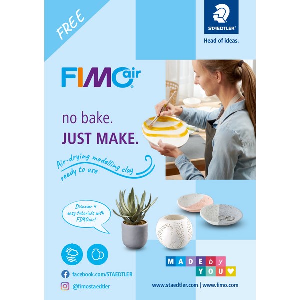 This Staedtler Fimo Air Dry Modelling Clay is ideal for arts and crafts projects either at home or in school. The clay has a smooth consistency, is dimensionally stable and comes ready to use. It is air drying without the need for a kiln. Hardened models can be modified (filed, sanded, drilled, painted, varnished). Comes in a 1kg pack.