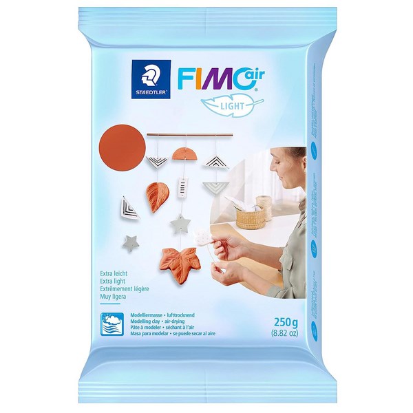 This Staedtler Fimo Air Dry Light Modelling Clay is ideal for art and craft projects at home or in the classroom. The clay is extremely lightweight and is ideal for projects such as jewellery, decorations and mobiles. It is air drying without the need for a kiln. Hardened models can be modified (filed, sanded, drilled, painted, varnished). Comes in a 250g pack.