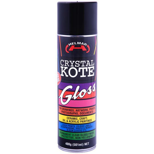 Helmar Crystal Kote Gloss Spray is a permanent clear gloss finish for use with a wide variety of art and craft works, such as prints, photographs, drawings, lettering, documents, ceramics, paper mache and many other mediums. It is non-yellowing and protects your artwork, ideal for students and artists.
