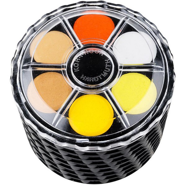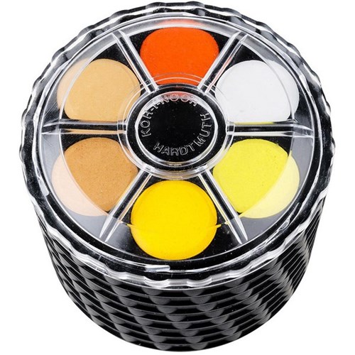 These Koh-I-Noor Watercolour Paint Discs are perfect for your next art and craft project at home or school. The paints have rich pigments that produce intense, inter-mixable colours. The paint discs come in stackable palettes, with six colours per palette, making it super easy to store, tidy and transport your watercolour paints. The clear plastic lid helps to keep the paints tidy and mess free whilst being stored and it can double as a mixing tray. Suitable for use on paper, cardboard and artist pads. Cleans up in soap and water.