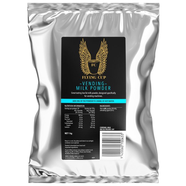Choose this Flying Cup Skim Milk Powder Vending Machine Refill for a great tasting low fat milk powder. Designed specifically for vending machines, the milk powder is ideal for creating delicious lattes, flat whites and cappuccinos. The handy size pack enables convenient storage and refilling so you never run short.