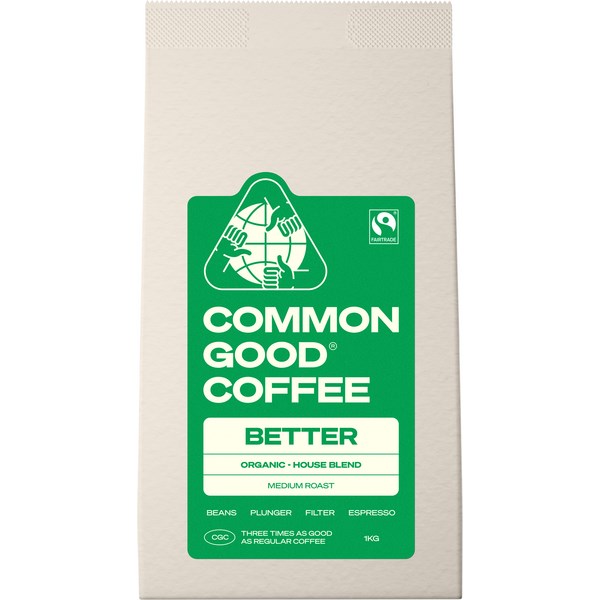 Choose this Common Good Coffee Fairtrade Better Blend Coffee Beans for a delicious cup of coffee. This multi-origin, full bodied medium to dark roast blend is full of flavour with chocolate, toffee, and hazelnut notes, complemented by long-lasting burst of vanilla and dark cocoa. The delicious coffee comes in a 1kg bag of whole beans and is suitable for use in all coffee machines.
