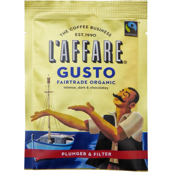 L'affare Gusto Fair Trade Organic Coffee Sachets are sure to please any coffee drinker with its rich, intense flavour which has hints of plum and dark chocolate. It is great for brewing in plungers and filter machines. The beans are sourced from Central America and East Africa and blended and roasted by L'affare's top roasters.