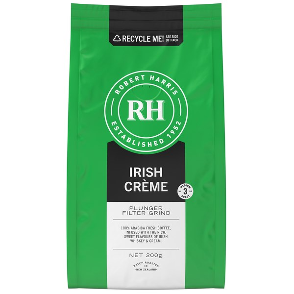 The Robert Harris Irish creme coffee is a full-flavoured Brazilian coffee-infused with rich flavours of whiskey and creme - without the alcohol. Roasted in New Zealand and is suitable for plunger and filter brewing methods.