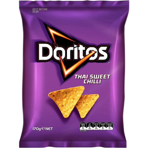 Doritos Sweet Chilli are delicious nacho style corn chips with a bold sweet chilli flavour. They can be enjoyed plain, smothered in rich melted cheese or dunked in your favourite salsa or dip. Perfect for parties, around the barbecue or just snacking on at when you need something to nibble on.