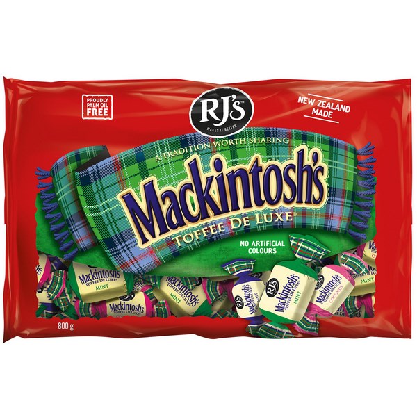 Treat everyone to some sweet lollies with these RJ's Mackintosh's Toffee Deluxe. They are not too hard and not too soft and come in six deluxe flavours: coconut, egg and cream, mint, malt, harrogate and toffee deluxe. The lollies are conveniently wrapped for hygiene and freshness and easy to open. Each bag contains approximately 105 lollies making them perfect for sharing around.