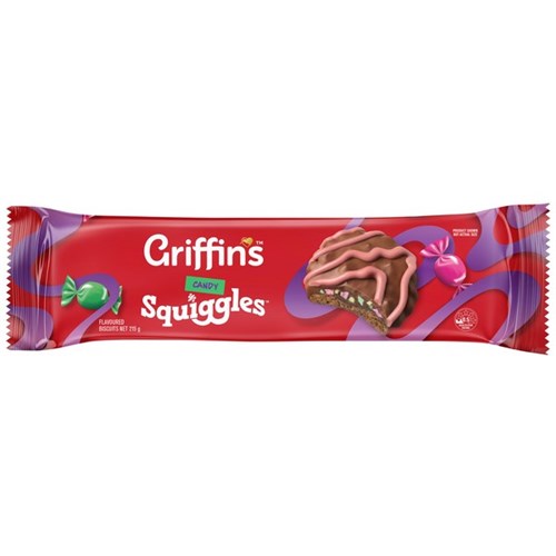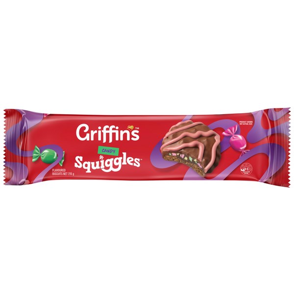 Griffins Squiggles Candy Biscuits are back. These delicious chocolate coated biscuits have a milk chocolate crème filling packed with crunchy candy pieces.