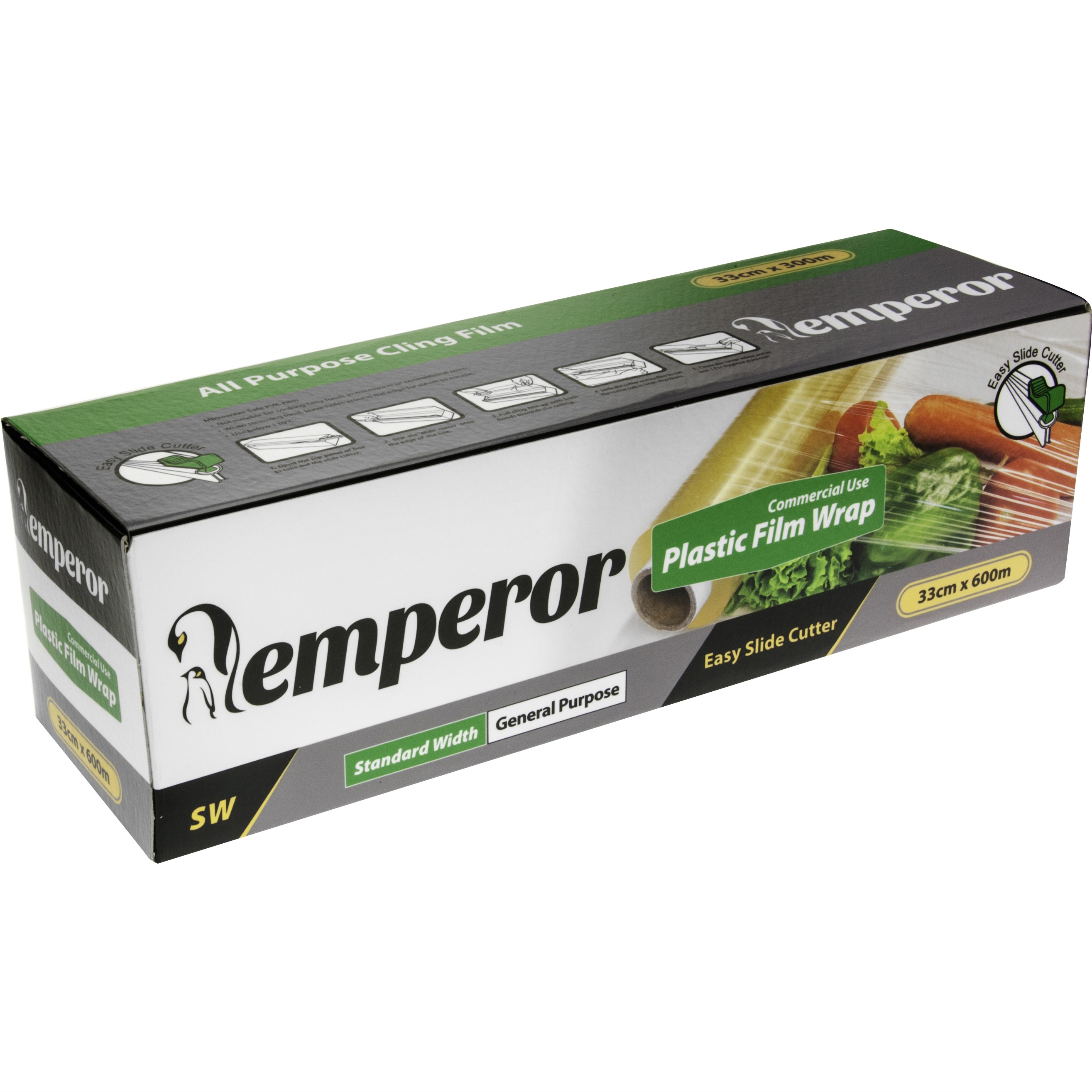 Emperor Plastic Cling Film Wrap With Dispenser is ideal for use in restaurants, cafess and catering environments. The large roll has a special slide-safe cutter on the dispenser for hassle-free dispensing. It can be used to cover bowls and tubs, or wrap food directly to keep it fresher for longer.