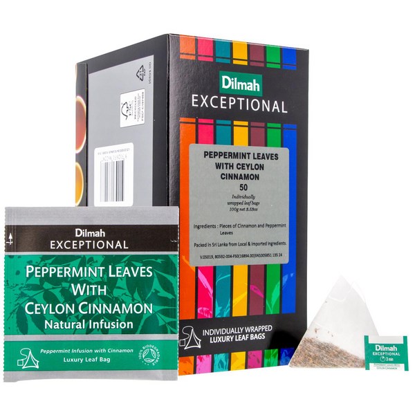 Dilmah Exceptional Peppermint & Cinnamon Tea is a fresh, lightly spiced infusion. The minty freshness of the peppermint leaves is perfectly balanced by the woody sweetness of the cinnamon. A refreshing drink that can be enjoyed hot or cold. Tea comes in a box of 50 individually wrapped luxury leaf bags.