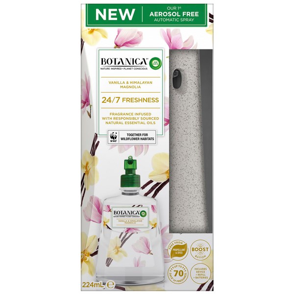 Use this Air Wick Botanica Automatic Spray Kit to freshen and your perfume your home. This Botanica Automatic Spray is infused with the delicate scent of Vanilla and Himalayan Magnolia and is a great low maintenance way to keep your environment fresh and fragrant. The Auto Sprayer has adjustable intensity and a boost button, allowing you to choose whether your fragrance is intense or delicate.