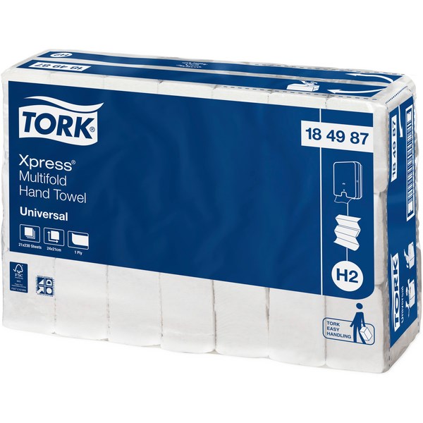 These Tork H2 Universal Xpress Multifold Paper Hand Towels are a quality hand drying solution for your washroom or bathroom. Excellent 1 ply absorbency and strength. Designed for use with Tork H2 dispensers.
