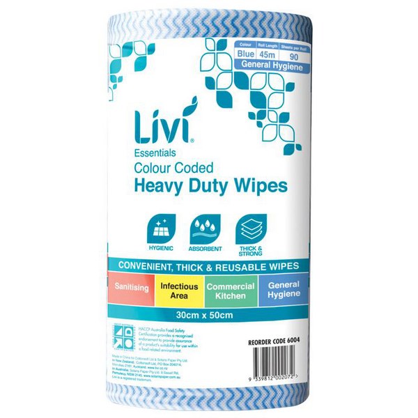 Avoid cross-contamination across your surfaces with this blue colour coded roll of Livi wipes. The non-woven wipe is 70gsm per square metre making them incredibly thick and strong for excellent absorbency rates. Each roll has 90 sheets which measure 300x500mm (wxl), each sheet is perforated for easy removal. The wipes can be washed and reused making this roll great value for money.