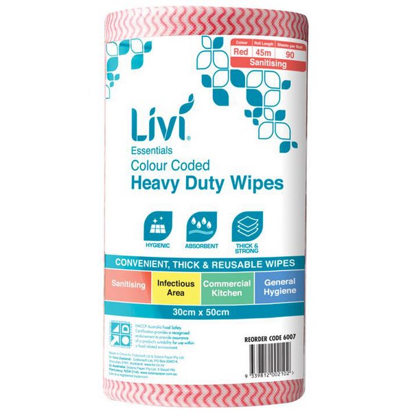 Avoid cross-contamination across your surfaces with this red colour coded roll of Livi wipes. The non-woven wipe is 70gsm per square metre making them incredibly thick and strong for excellent absorbency rates. Each roll has 90 sheets which measure 300x500mm (wxl), each sheet is perforated for easy removal. The wipes can be washed and reused making this roll great value for money.