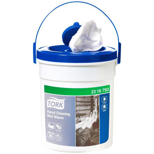 Great for cleaning "on the go", Tork Hand Cleaning Wet Wipes are convenient pre-moistened wipes ideal for cleaning grime, grease and tough dirt. Thick and durable, the disposable wipes are gentle on skin. The handy, portable bucket allows you to place them where needed and a re-sealable lid protects the wipes from drying out.