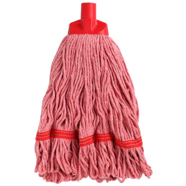 This red Fita anti-tangle washable cotton mop head features a looped end with an angled tail banding for easy laundering, along with a heavy duty mop socket. It is a hospital launder mop head that complies with regulations set by authorities for the healthcare industry. The bright red colour allows you to colour coordinate your mops to prevent cross-contamination.