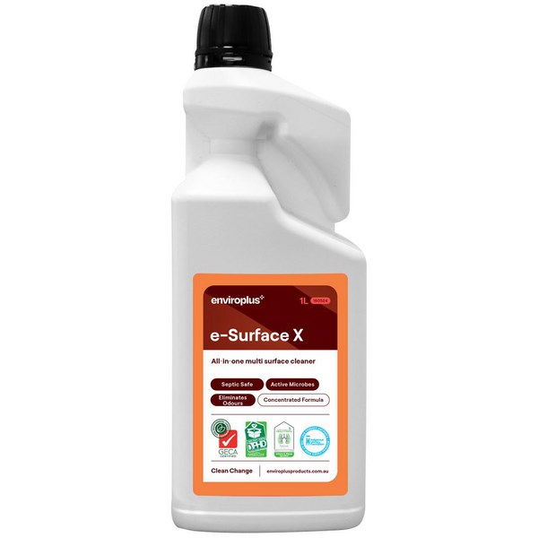 Enviroplus e-Surface X Multi-Purpose Concentrated Cleaner is a specialised cleaning product ideal for use on a variety of surfaces. The cleaner contains microbes that can penetrate porous surfaces and create self-renewing biofilms, which provide long-term residual cleaning and effective odour control.