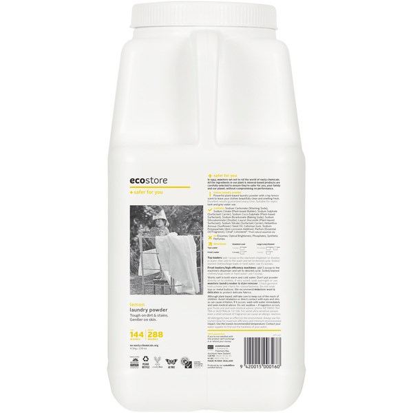 This ecostore Laundry Powder has a plant-based powder formulation that powerfully cuts through dirt, leaving your laundry clean and smelling fresh with a subtle fragrance of lemon. It does not contain any unhealthy chemicals like optical whiteners and artificial fragrances - as a result the powder is not only great for your wash, it's also kinder to your skin and a safer option for those with sensitive skin or allergies. This laundry powder is suitable for front and top loader washing machines.