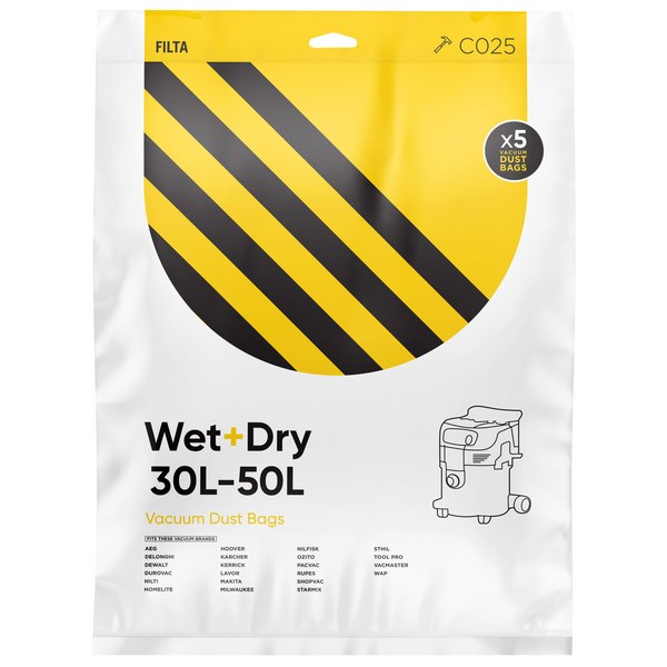 These Filta Wet & Dry SMS Multilayered Vacuum Cleaner Bags feature excellent airflow to provide strong suction even while the bag fills up. The strong SMS multilayered vacuum cleaner bags are designed with high air filtration to capture and trap dust particles including concrete and gib board dust. Suitable for use with wet and dry vacuum cleaners and work shop vacuums.
