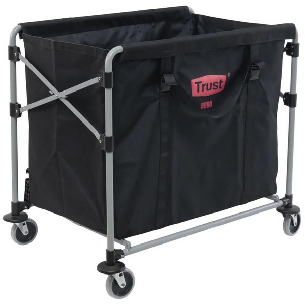 The Trust Collapsible Linen Cart is a durable and versatile solution for storage and transportation needs. It features robust metal framing that ensures strength and stability for secure storage and easy mobility. The cart's adjustable shelves and foldable design make it suitable for use in compact spaces and easy to store when not in use. It also offers the functionality to be linked together using a hook feature, allowing for seamless connectivity between multiple carts. The cart is specifically designed to accommodate 240L Linen Bag (sold separately).