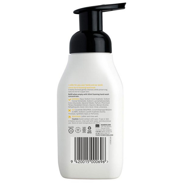 This ecostore Foaming Hand Wash Citrus Burst is made from naturally derived, uplifting citrus burst scent with mandarin, orange & lime ingredients. It contains hydrating harakeke extract, to gently cleanse, nourish and condition your skin without stripping natural oils and leaves your skin soft and smooth. It comes in handy 250ml pump bottle, ideal for the bathroom or kitchen.