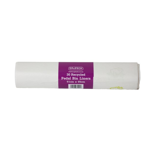 These 20mu EP Tech Recycled Pedal Bin Liner Rubbish Bags are made from post-consumer recycled content. Each pedal bin liner measures 510x650mm and has a 27-litre capacity. Made from sturdy and durable HDPE these trash bags help contain odours and allow you to easily dispose of waste and keep rubbish bins clean. Ideal for use in work environments, offices, schools and at home. Bags come in a roll of 30.