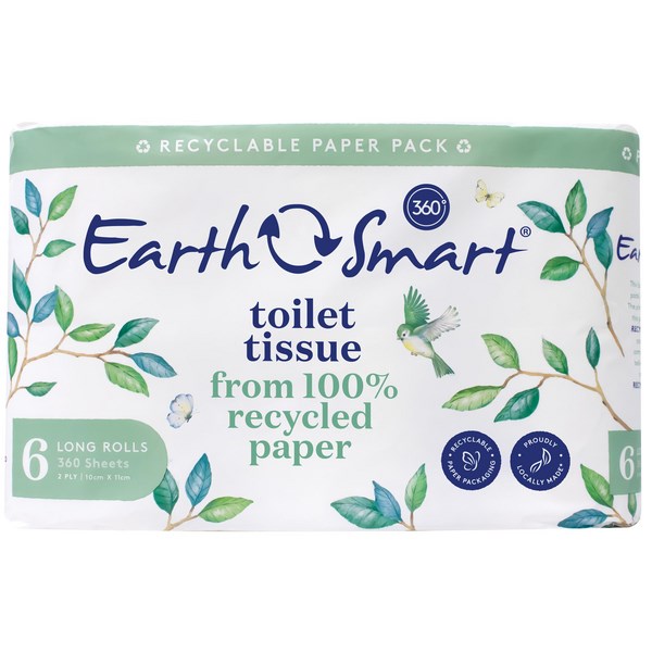 EarthSmart Toilet Tissues are soft and absorbent making them a great bathroom option. Each carton contains 5 packs each containing 6 long toilet tissue rolls, each roll has 360 sheets with a 2 ply thickness. Toilet tissues are made from 100% recycled materials packaged in a paper pack that recyclable. Proudly made in NZ from local and imported material.