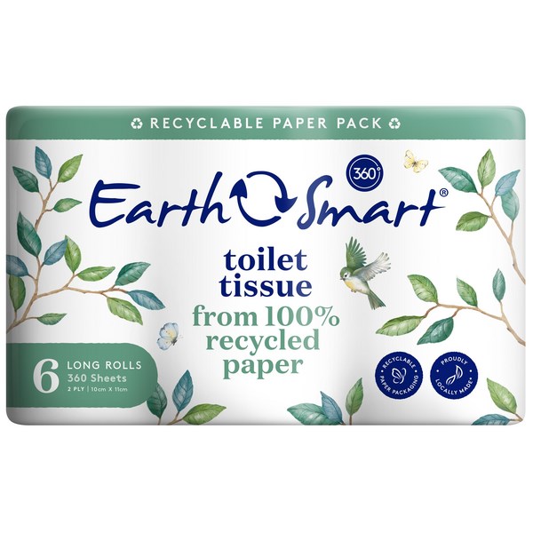 EarthSmart Toilet Tissues are soft and absorbent making them a great bathroom option. Each pack contains 6 long toilet tissue rolls with 360 sheets that have a 2 ply thickness. Toilet tissues are made from 100% recycled materials packaged in a paper pack that recyclable. Proudly made in NZ from local and imported material.