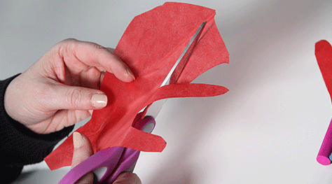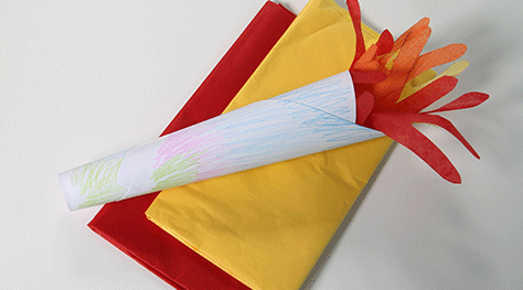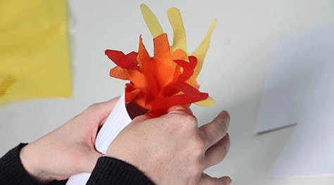 Get the children to trace their hands onto red, yellow and orange paper (or paper you have dyed or painted). Cut out the hand shapes and staple together to make a round open looking flame. Use sticky tape or glue to secure the paper to the inside top of the tube.
