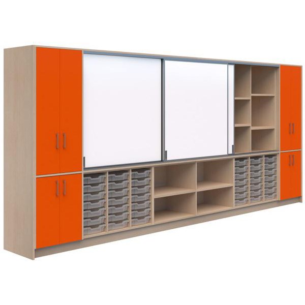 The Ako Classroom Hub C1 is a versatile storage solution, ideal for use in schools and education environments. The two large upper cupboards and two lower cupboards are non-locking for easy access. There are 42 F1 Gratnells trays, perfect for each student to have their own storage space and keep their work organised. The magnetic receptive whiteboards are a great teaching and display resource whilst also being sliding doors to cover internal shelving. Plenty of space for storing papers, books, and other classroom equipment.