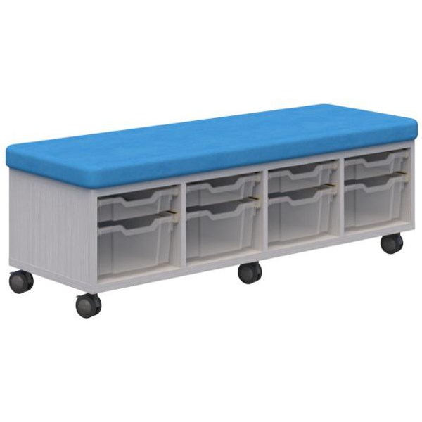 The Ako Sit & Store Bench Seat is a mobile bench with an upholstered in Ashcroft fabric seat and storage underneath. Designed to provide both comfortable seating and organisation, it is perfect for classrooms and other educational or learning spaces. It features heavy duty locking castors for flexible placement and stability when in chosen location. It includes four F1 and four F2 translucent Gratnells trays, great for storing student’s work, books, and other resources.