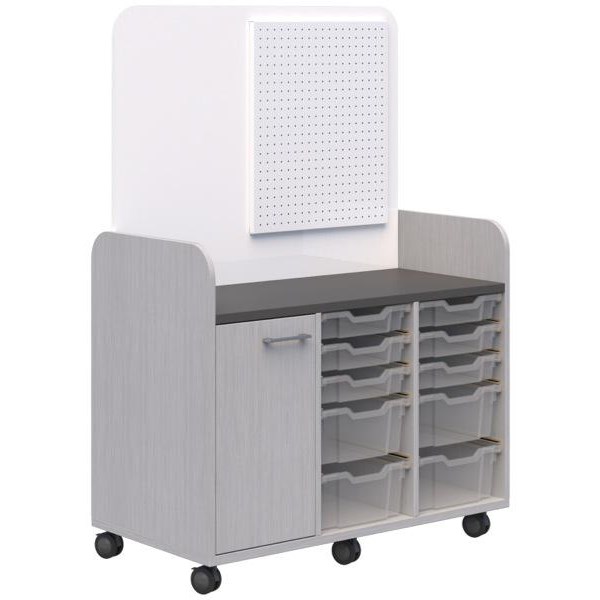 This Makerspace Mobile Trolley is the perfect way to store all your makerspace materials in one easily accessible space. The trolley features 6x 70mm locking plate castors that let you conveniently wheel your trolley wherever you need it. The mobile trolley comes with 6x F1 and 4x F2 translucent Gratnells trays for simple storage. The mobile trolley has a write-able HPL whiteboard and a steel pegboard with 6x 50mm hooks to hang tools.
