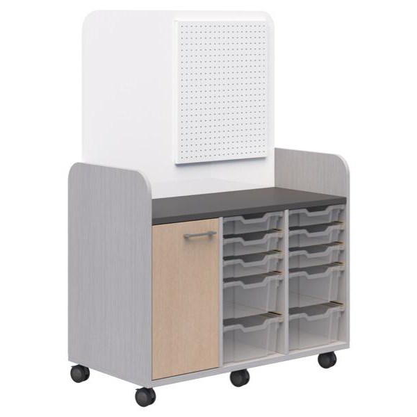 This Makerspace Mobile Trolley is the perfect way to store all your makerspace materials in one easily accessible space. The trolley features 6x 70mm locking plate castors that let you conveniently wheel your trolley wherever you need it. The mobile trolley comes with 6x F1 and 4x F2 translucent Gratnells trays for simple storage. The mobile trolley has a write-able HPL whiteboard and a steel pegboard with 6x 50mm hooks to hang tools.