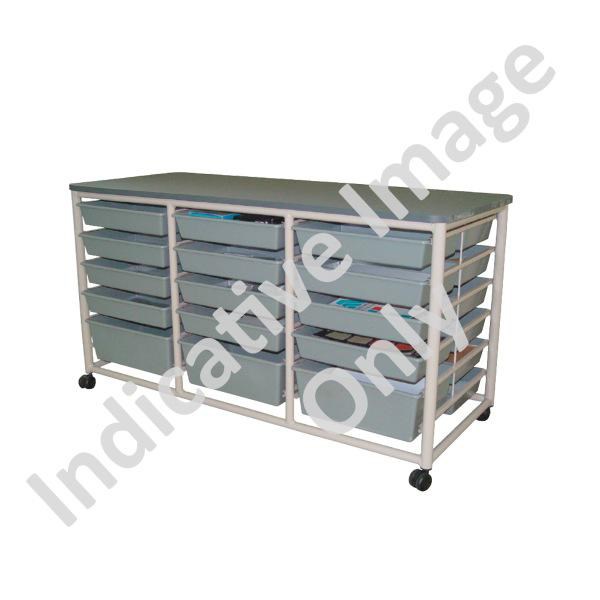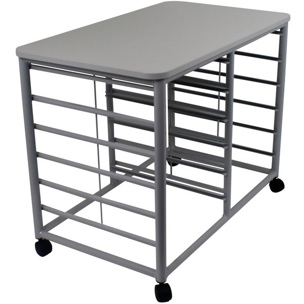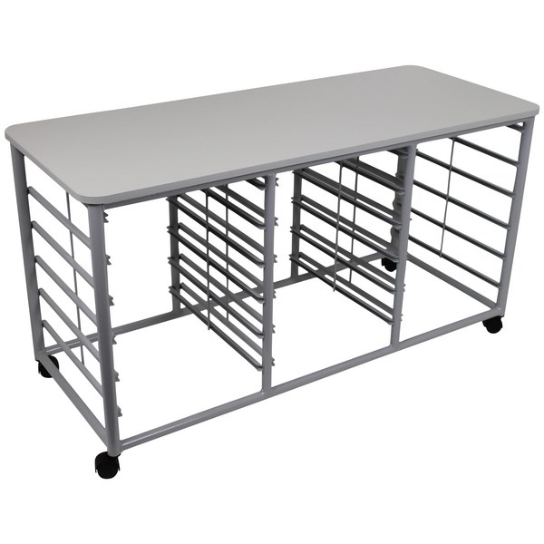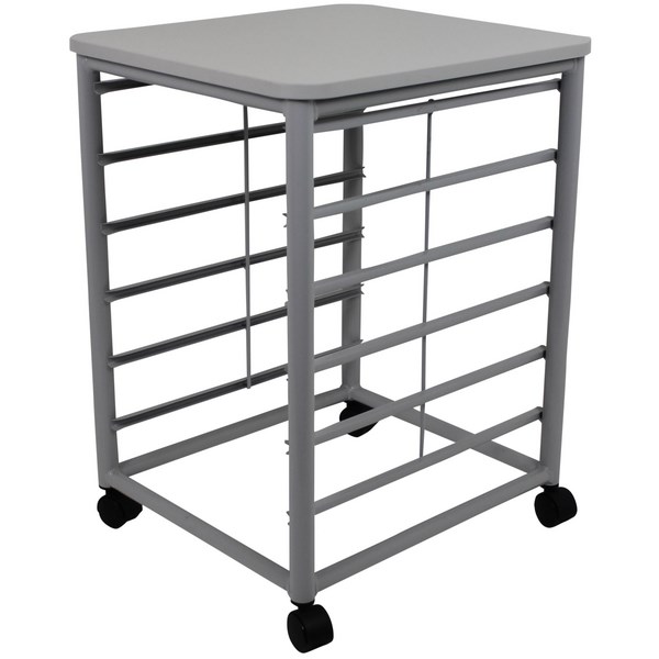 •Tote storage trolley with grey Melteca top and a robust 32mm powder coated silver steel frame