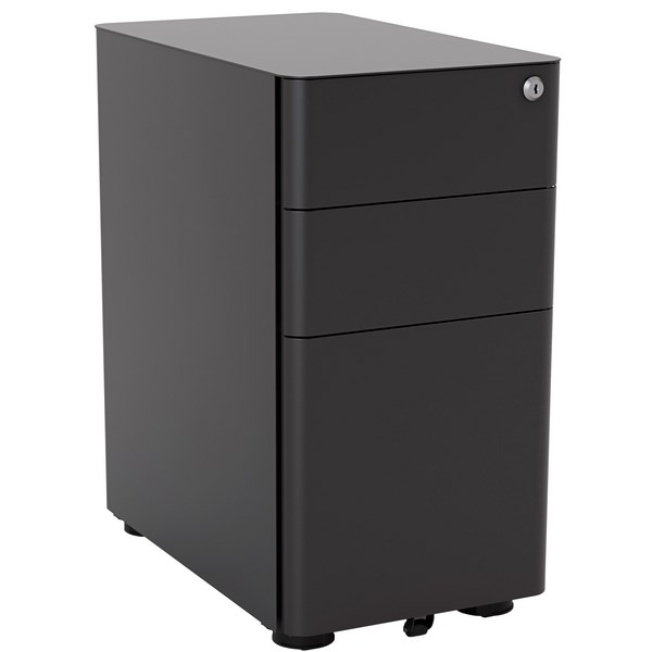 This Breeze Slimline Mobile Pedestal is the perfect storage solution for all your stationery and file storage. It has a sturdy metal construction with a black powder coated finish. There are 2 small drawers for stationery and office supplies or personal items and a large suspension file drawer with a filing conversion bar that fits A4 documents and paperwork. The interlocked drawers have full extension ball bearing runners for smooth operation. This handy unit slides easily under your desk with high-quality low set castors and the hidden side handle makes it easy to manoeuvre.
