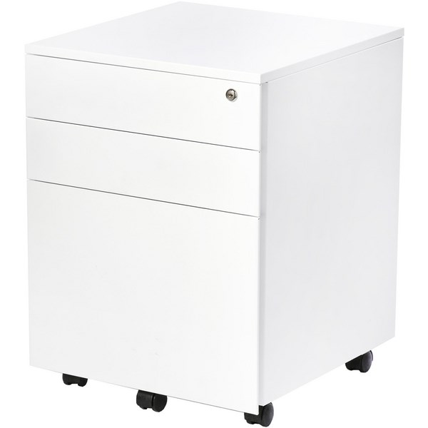 •A white 3 drawer mobile pedestal that is ideal for home and office use (2 pen and 1 file drawer)