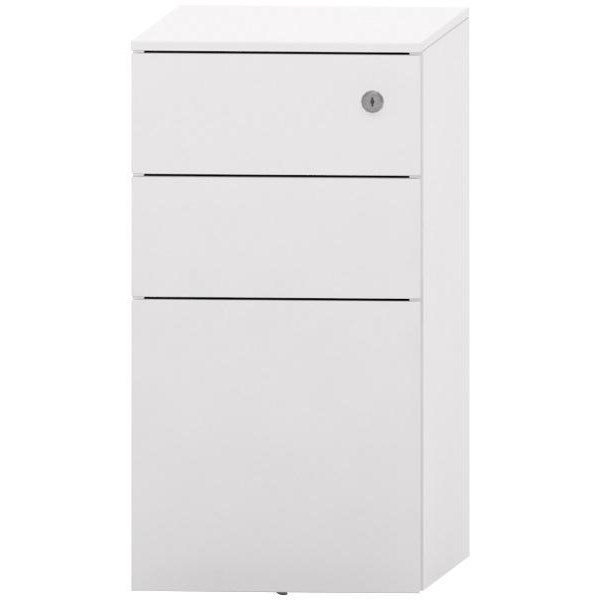 This White Fiord Slim Mobile Pedestal is metal and has 3 drawers. This metal pedestal has a powder coated finish and the simple, contemporary design will suit any office. It features 2 standard drawers and 1 file drawer, an anti-tilt castor wheel, a pen tray, drawer dividers and a sturdy steel construction.