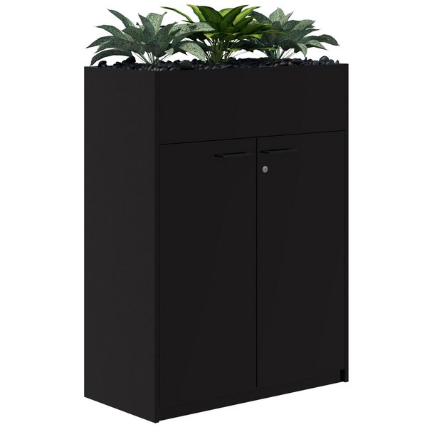Add a modern stylish piece of furniture to your space with this Fiord Lockable Storage Planter Hinged Door. It is made up of a lockable storage unit with a planter on top. The planter holds up to 3 artificial plants on a platform filled with polished black stones. Unit comes fully assembled but plants and stones need to be placed inside the planter box.