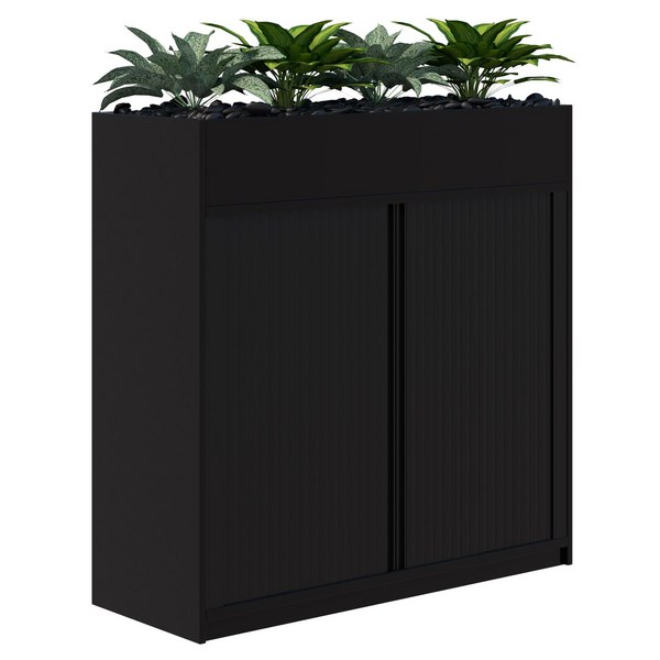 This Fiord Tambour Storage Unit has tambour-style doors that roll open, requiring no additional floor space for opening. It is ideal for storing all your files, documents, stationery and personal items. The planter on top of the unit is ideal for adding non live plants.