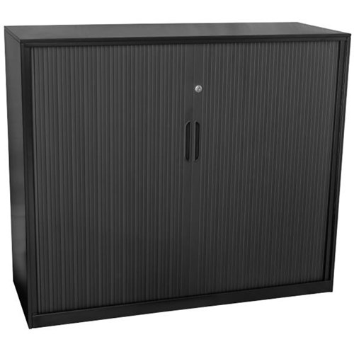 This Proceed Tambour Storage Cabinet has a sturdy construction with a matte black powder coated finish and matching PVC doors. The tambour-style doors require minimal space and make the units ideal for use in smaller offices. This unit has 2 adjustable shelves and is ideal for storing papers, files, stationery and personal items.