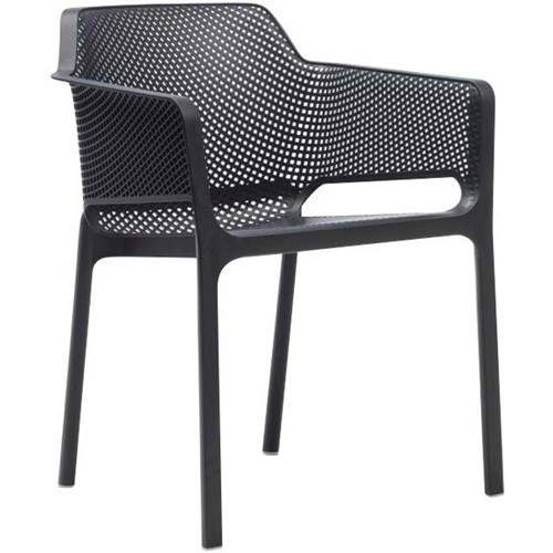 This Net Cafe Chair is a practical addition to any restaurant or cafeteria. It has a durable construction and is made from fibreglass and polypropylene resins. It has special UV additives making it suitable for both indoor and outdoor use. The matt finish and bold black colour will make a statement in any space. The unusual mesh look design is attractive and allows for ventilation. They are easily stackable for storage convenience.