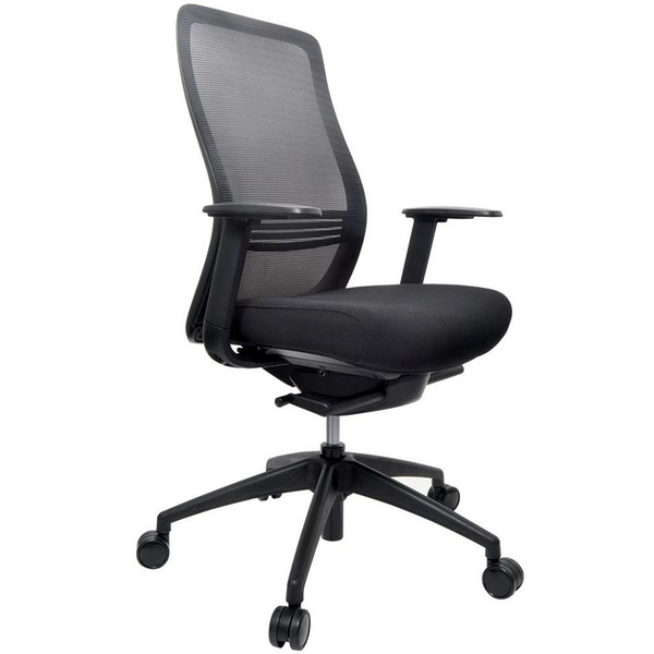 •A mesh back task chair with a synchronised mechanism and black fabric seat upholstery