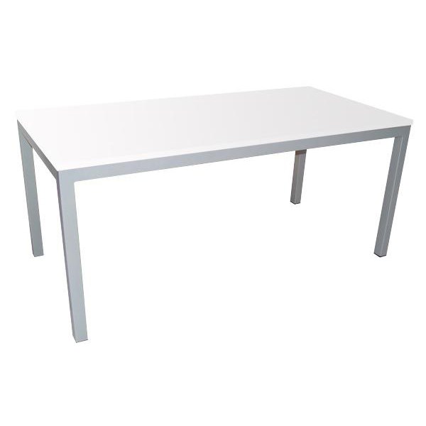 •A sturdy meeting table with a white Melteca top and silver powder coated steel frame