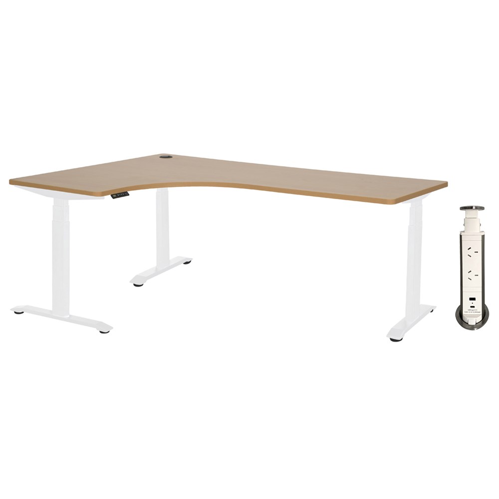 This Amplify Electric Workstation is a corner desk with a great practical design. Its height adjustable feature allow users to switch between sitting and standing for comfort. With a built-in cable port, wires from electric devices can be kept safe and tidy. The desk top has a melamine finish with ABS edging which is durable and easy to clean. Built in levelling glides are installed to keep the desk steady and prevent wobble.