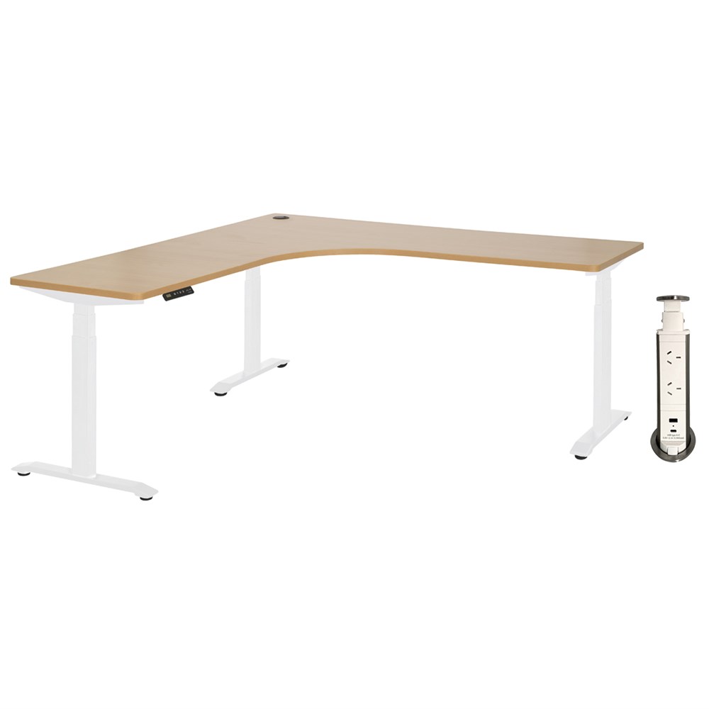 This Amplify Electric Workstation is a corner desk with a great practical design. Its height adjustable feature allow users to switch between sitting and standing for comfort. With a built-in cable port, wires from electric devices can be kept safe and tidy. The desk top has a melamine finish with ABS edging which is durable and easy to clean. Built in levelling glides are installed to keep the desk steady and prevent wobble.