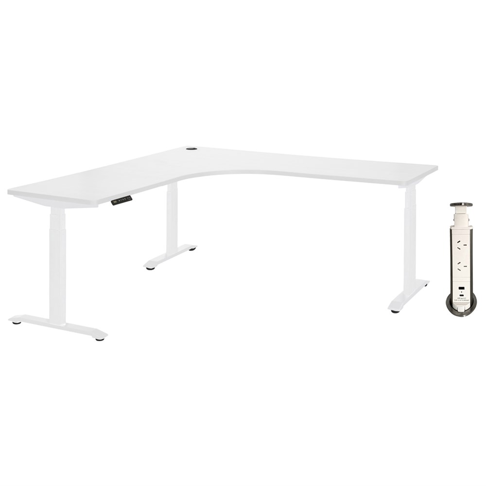 This Amplify Electric Workstation is a corner desk with a great practical design. Its height adjustable feature allow users to switch between sitting and standing for comfort. With a built-in cable port, wires from electric devices can be kept safe and tidy. The desk top has a melamine finish with ABS edging which is durable and easy to clean. Built in levelling glides are installed to keep the desk steady and prevent wobble.