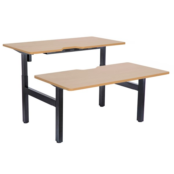 This Emerge Desk features two back to back desks with black powder-coated steel frames and beech melamine scallop desktop. One desk is a fixed height and the other is height adjustable, giving your work space plenty of flexibility. The height adjustable desk has 3 programmable heights and operates at 25mm per second.