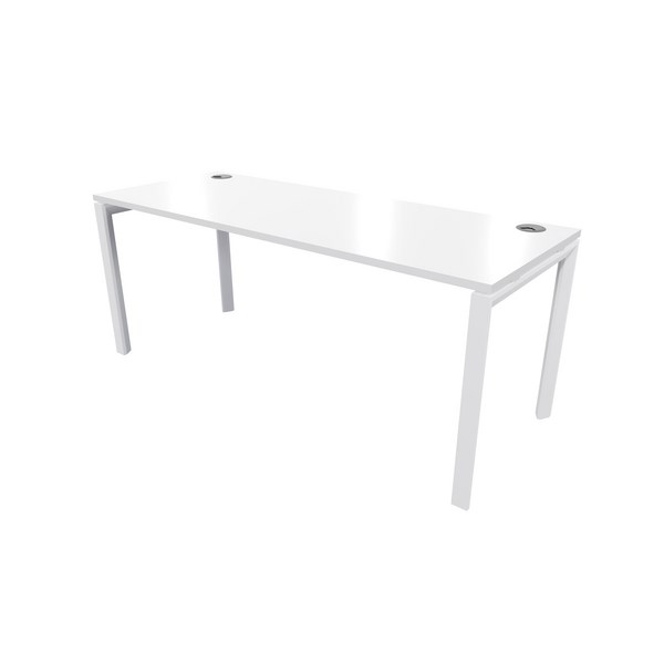 The Novah Workstation is a sleek and modern commercial office desk with a stylish white powder-coated steel frame base supported by levelling feet. It features convenient cable management ports and a 25mm Melamine top with a rigid matching PVC trim for a polished look.
