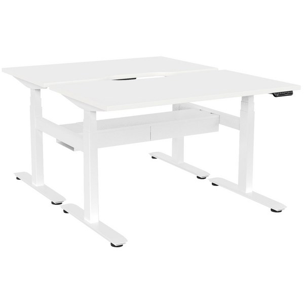 • Double sided electric height adjustable desk pod with White scallop tops and a White frame
